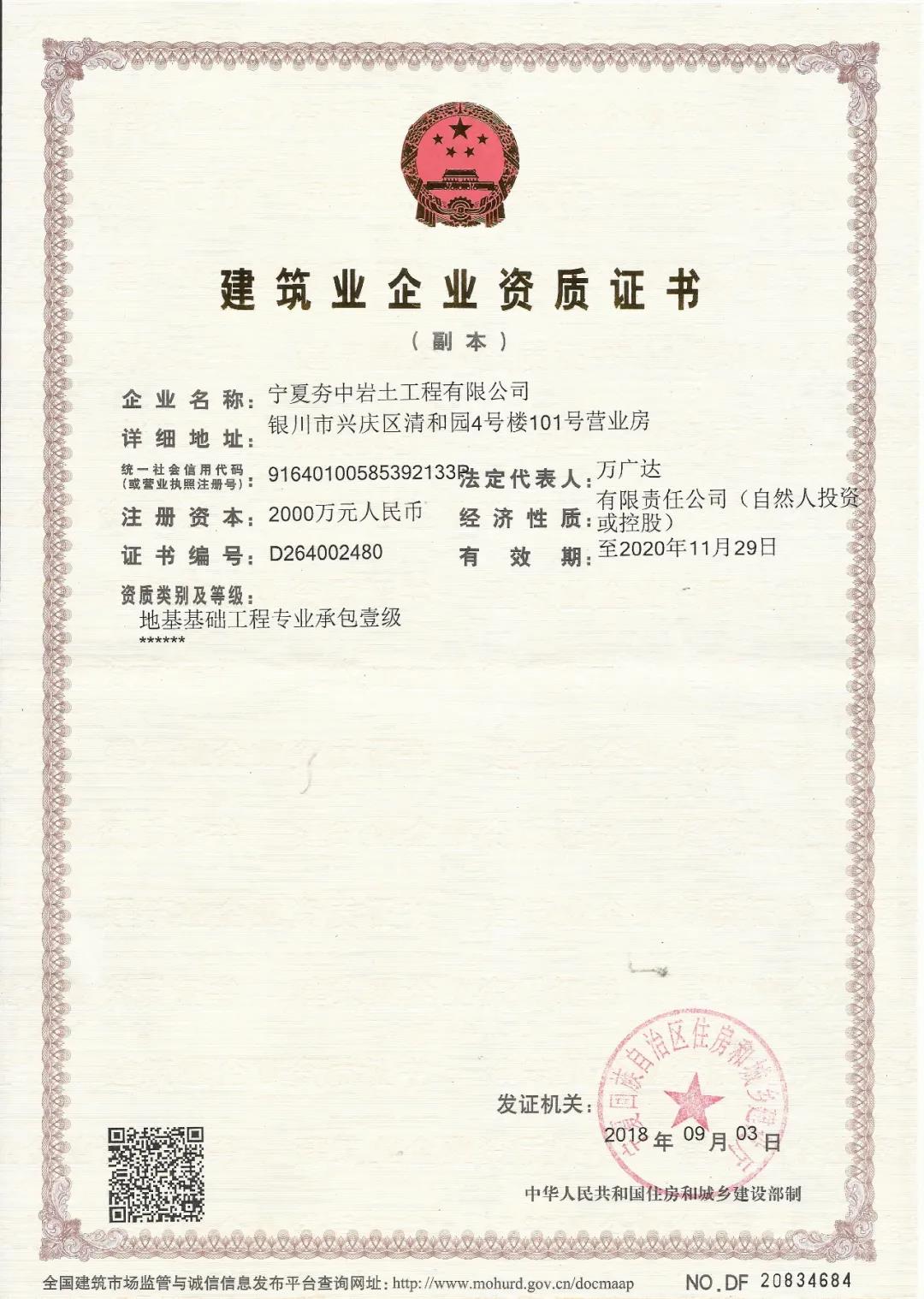 寧夏夯中巖土工程有限公司成立于2012年,擁有地基與基礎(chǔ)工程承包一級施工資質(zhì)以及地質(zhì)災(zāi)害治理工程資質(zhì),主要從事各類樁基基礎(chǔ)、地基處理、基坑及邊坡支護等基礎(chǔ)工程的研發(fā)、設(shè)計與施工。